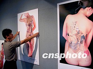 在广州美术馆内,庞国华和朱贤龙十日向媒体展示了他们合作的人体彩绘摄影作品。他们的作品以女性人体之柔美配之相应的肢体语言和摄影元素,给人一种耳目一新的感觉。作者:罗仰明