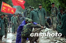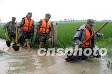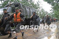 清晨赶到焦岗湖大堤的南京军区某集团军官兵,连营房都没进,就冲到了一线,为焦岗湖防险搭起了第二道堤防线。