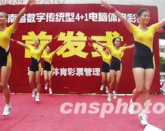 七月十二日,海南省率先在全国推出“四加一”体育彩票新玩法。在海口金世纪广场举行的首发仪式上,模特跳舞表演助兴。作者:王辛莉