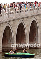 七月十三日,北京颐和园著名景点十七孔桥上人头攒动。当天,实行优惠票价的颐和园迎来“非典”疫情后的最高客流量。中新社记者:张炜