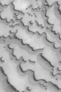 7月13日,来自美国国家航空和宇航局(NASA)的火星全球测量员(MGS)和火星卫星照相机(MOC)的图片显示,火星北极冰冠附近的沙丘。冰冠被大片受风吹蚀的黑暗沙丘包围。