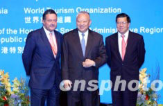 香港特首董建华(中),7月14日在会展中心与博鳌亚洲论坛秘书长龙永图(右)及世界旅游组织秘书长弗朗加利主持“重振亚洲旅游业会议”开幕礼。中新社记者:洪少葵
