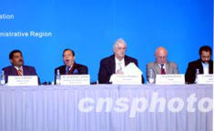 2003年7月14日在香港举行的“重振亚洲旅游业会议”全体大会上,[左起]瓦努阿图旅游部长Jean Alain Mahe、孟加拉国国民用航空和旅游部长Mir Mohammad Nasir Uddin、加拿大旅游委员会副总裁Thomas Penney、世界旅游旅行委员会主席鲍姆加腾、伊朗驻华大使Fereydoun Verdinejad等嘉宾出席会议并发表专题演讲。中新社记者:洪少葵