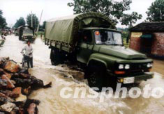 解放军南京军区急调军车,向七月中旬淮河行洪区的安徽省阜阳地区运送救灾品。当地农村到处是内涝洪水,车队涉水直奔灾区。作者:闫宏宇
