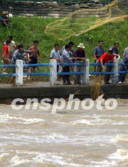 今夏淮河洪水淹没千里渔米之乡的鱼塘,养鱼农民血本无归。安徽省阜阳县的养鱼农民坐在洪水边欲哭无泪。中新社记者:贾国荣