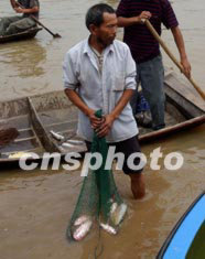 今夏淮河洪水淹没千里渔米之乡的鱼塘,养鱼农民血本无归。安徽省阜阳县王家坝的渔民和村民目前抓紧撒网捕捞流失之鱼,略补生活损失。中新社记者:贾国荣