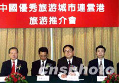 江苏省连云港市十七日在香港举行旅游推介会,寻求与香港及海外旅游界的合作。图为连云港市旅游局局长李道莹(右二)在推介会上。作者:谢育元