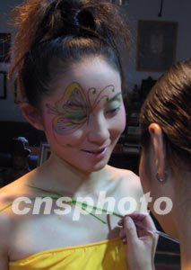 一名爱美的福州女子十八日欣然接受职业化妆师的彩绘装扮。人体彩绘在福州成为一种时尚。作者:刘可耕