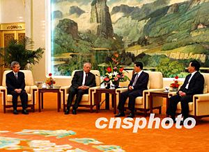 中国国家主席胡锦涛和副主席曾庆红,七月十九日在北京人民大会堂会见香港特首董建华和行政长官办公室主任林焕光。中新社记者:贾国荣