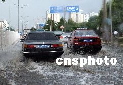 19日下午,北京大部分地区突降暴雨,造成街路上车辆和行人通行不便。图为北京东二环上艰难行走的车辆。樊甲山 摄