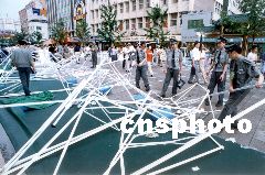 一场短时强暴风雨袭击了北京王府井大街,将街口十多座旅游景观宣传棚摧毁,现场一片狼籍。中新社记者 邹宪 摄