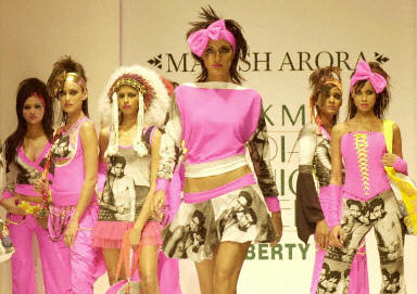 从7月17日至27日在印度孟买举行的流行时装周上将有57名设计师展示他们的作品。图为印度模特展示设计师Manish Arora的作品。