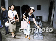 长江三峡蓄水后吸引了许多人的关注。七月中旬,一百多位台湾游客来到夔门参观游览。图为台胞在白帝城东碑林抚摸观音像,从头摸到手表示家里样样有。作者:李中全