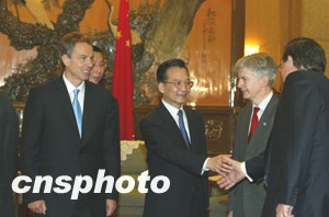 中新社北京七月二十一日电中国总理温家宝今天上午在人民大会堂与来访的英国首相布莱尔举行了会谈。