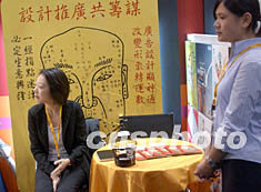 香港家庭用品、礼品及赠品综合展,七月二十三日在香港会展中心开幕,图为展会上一广告商以看相指点迷津吸引参观者。中新社记者:钱兴强