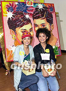 人气组合Twins两名成员钟欣桐(左)、蔡卓妍7月23日在香港出席《Jelly Belly“Twins”糖豆画》宣传活动,“Twins”糖豆画用上五十种颜色壹万粒Jelly Belly糖豆黏到木板上成画。作者:邓庆乐