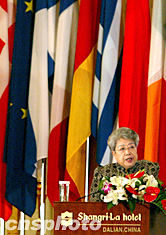 中新网7月24日电第五届亚欧经济部长会议于今天上午9点在辽宁省大连市香格里拉大酒店举行,国务院副总理吴仪出席会议开幕式并致辞。