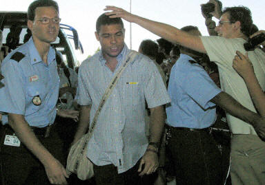 大批球迷到马德里机场欢送皇马亚洲之旅。罗纳尔多受球迷“偷袭”。