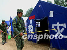 安徽省淮河洪水灾区的阜南县王家坝又遇七月下旬的高温,当地武装部派出民兵紧急喷洒消毒剂防疫。中新社记者:贾国荣