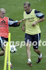 西班牙皇家马德里足球队二十六日下午在昆明冒雨训练,齐达内表演娴熟的盘带过人技巧。中新社记者:毛建军