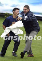 一名在昆明观看西班牙皇家马德里足球队二十六日下午在的训练的狂热球迷跳入场中,口中呼喊着劳尔的名字,希望得到签名,被及时赶来的工作人员阻止。中新社记者:毛建军