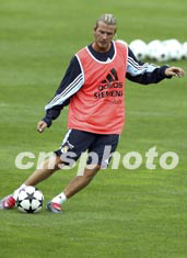 西班牙皇家马德里足球队二十六日下午在昆明冒雨训练,贝克汉姆渐入状态,展示他的脚下传世神功。中新社记者:毛建军