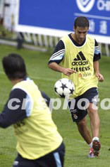 西班牙皇家马德里足球队二十六日下午在昆明冒雨训练,图为劳尔在对抗训练中带球过人。中新社记者:毛建军