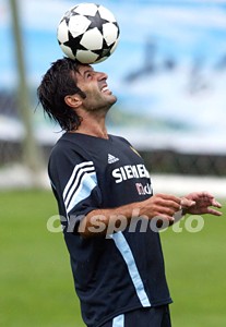 皇马巨星菲戈雨中练习头球功夫。中新社记者:毛建军