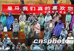 各地球迷二十七日在昆明冒雨观看皇家马德里足球队巨星们的训练,激情依然不减。中新社记者:毛建军