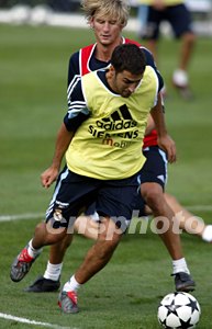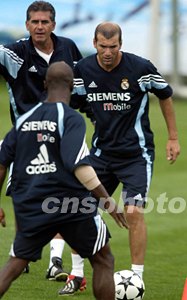 皇家马德里足球队技战术训练,主帅奎罗兹在齐达内身后督战。中新社记者:毛建军