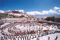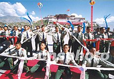 “八一”前夕,武警西藏总队组织驻拉萨部队官兵在布达拉宫广场举行“庆祝建军七十六周年藏歌藏舞文艺汇演”,千余名武警官兵和藏族群众跳起大型锅庄舞,布达拉宫广场成了歌舞的海洋。作者:赵艳志