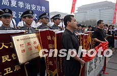 北京警方二十七日举行“夏季治安攻势追缴物品发还仪式”,部分被盗汽车失主取回汽车后向警方赠送锦旗。中新社记者:任海霞