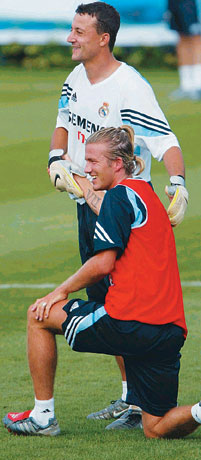 在随后11打11的大对抗中,小贝仍然被分在替补一组,表现平平。在后卫的紧逼之下,小贝在曼联时那种姿态优雅的传中根本看不到。而在一次回防时,小贝竟将齐达内的传球铲进了自家大门。这个乌龙球也成了小贝在昨天训练中唯一的收获。