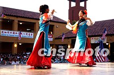 北加州华人运动会好时威之夜颁奖晚会七月二十六日晚在美国圣荷西市举行,生活在美西湾区的华裔演艺人士为颁奖晚会献上了精彩的演出。图为中华演艺学院的学员表演蒙族舞《情思》。作者:陈钢