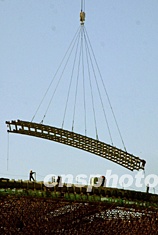 七月底,中国国家大剧院施工工程进入壳体结构安装阶段,六百吨巨型履带吊车通过远距离作业,用长达一百零八米的“钓线”以“空中钓鱼”的方式将一块块长三十五米的钢组合梁送到四、五十米的高空,组成钢结构穹顶。中新社记者:廖文静