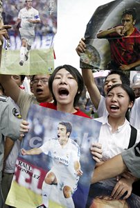 从八月一日凌晨开始,众多北京球迷聚集在皇家马德里足球队下榻的北京饭店门前,高声呼喊戴维、劳尔等人的名字,渴望一睹巨星风采。大批保安人员和警察在门口维持秩序。中新社记者:张炜 毛建军