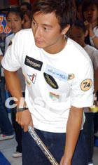 图:方力申身穿印有NO WAR ON IRAQ字样的T恤