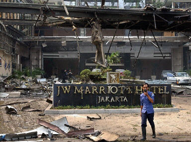 爆炸发生后,浓烟烈火从酒店的地下层冒出来。爆炸已经摧毁了一个酒店里的一家餐厅,酒店的大堂也部分受损。酒店的大堂以及门口停放的8辆汽车在燃烧。酒店及附近一幢高楼的多个楼层窗户的玻璃被震碎。印尼《罗盘报》的一名记者说:“我看见几辆出租车在燃烧,我相信是汽车炸弹引起了爆炸。八名受伤的人中有外国人。”