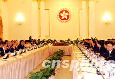 “粤港合作联席会议”第六次会议8月5日在香港礼宾府举行,特首董建华率领政府高官出席会议。中新社记者:洪少葵