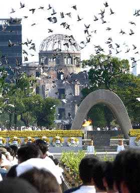 当地时间8月6日,日本广岛正在为美国原子弹轰炸广岛58周年而举行纪念活动。图为在广岛的和平纪念公园,一群和平鸽飞向天空。