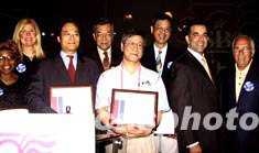 华裔小商业八月五日成为纽约纳斯达克交易所的明星,四名华裔商家在这里受到美国联邦中小企业管理局的表彰。图为美国联邦中小企业管理局局长赫克托·巴雷特(右二)向获奖者颁奖。作者:赵海燕