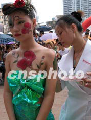 七日,在广州上下九商业步行街广场上,一场精彩的人体彩绘吸引众多市民驻足观看。在广州,人体彩绘已成为商业推广中的一项主要活动。作者:刘卫勇