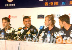 香港足球总会八月七日在香港举行记者会,皇家马德里足球队球星鲁尔、朗拿度、碧咸、摩连迪斯出席记者会。 中新社记者:钱兴强