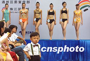 百余名泳装佳丽竞相登场。一名观众席上的小帅哥跃跃欲试当众摆出潇洒姿势。中新社记者:廖文静