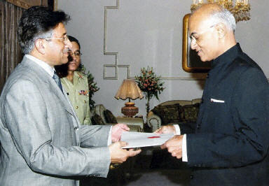 8月9日,印度新任命的驻巴基斯坦高级专员(大使)西夫·沙恩卡尔·梅农(右)向巴基斯坦总统穆沙拉夫递交了国书。此前,在印度首都新德里也举行了同样的仪式。这标志着印巴两国正式全面恢复外交关系。