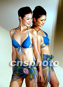 2003年“维倚”南方新丝路模特大赛复赛,8月10日在广州美博城举行,123名选手参加了角逐。分三个环节《迷你炫风》、《出水芙蓉》、《国色天香》之经典丽人行。图为迷人诱惑泳装显示出女性的美。作者:刘卫勇