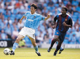 这是曼城备战新赛季英超的最后一场比赛,同时也是曼彻斯特大球场的揭幕战,因此,主教练基冈格外重视。孙继海首发出场担任右后卫,他的身后是门将西曼。而他面对的是刚刚转会巴塞罗那队的小罗纳尔多的进攻。第5分钟,奥维马斯带球突破菲利普斯后获得很好的机会,孙继海上前封堵,逼得奥维马斯传球出界。虽然对手实力很强,但在主场作战的曼城仍与对手展开对攻。孙继海与菲利普斯这边的进攻明显要比左路活跃。第34分钟曼城首先打破僵局,贝尔科维奇中路得球后转身快速突破,雷茨格尔慌乱中将球误传给阿内尔卡,法国人门前右脚推射破门。上半场曼城一球领先巴塞罗那。