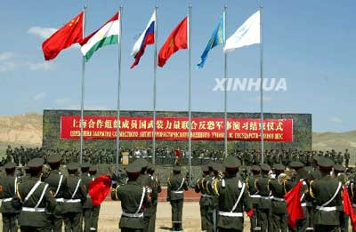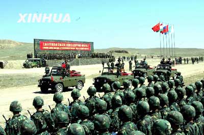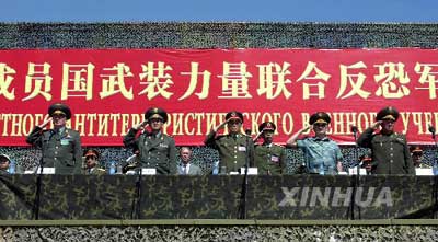 中新网8月13日电 代号“联合——2003”的上海合作组织成员国武装力量联合反恐军事演习12日在新疆伊宁市附近地区进行了城镇清剿、解救人质和攻打营地、联合围歼恐怖分子的实兵演习后圆满结束。中央军委副主席、国务委员兼国防部长曹刚川和各参演国军事代表团团长在观摩演习后出席了演习结束仪式并检阅参演部队。(文图来源:新华网)