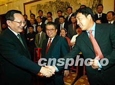国务委员唐家璇十三日在北京会见“华侨华人回国(来华)创业成功人士座谈会”与会代表。中新社记者:满会乔
