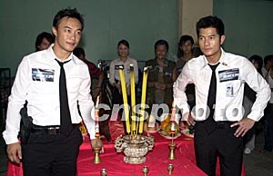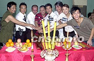 电影《重案黐孖GUN》台前幕后进行开镜拜神仪式。港产电影《重案黐孖GUN》片中男女主角陈奕迅、郭富城、王杰、郑希怡、黄品源等台前幕后8月13日在香港为该片举行开镜拜神仪式。作者:邓庆乐